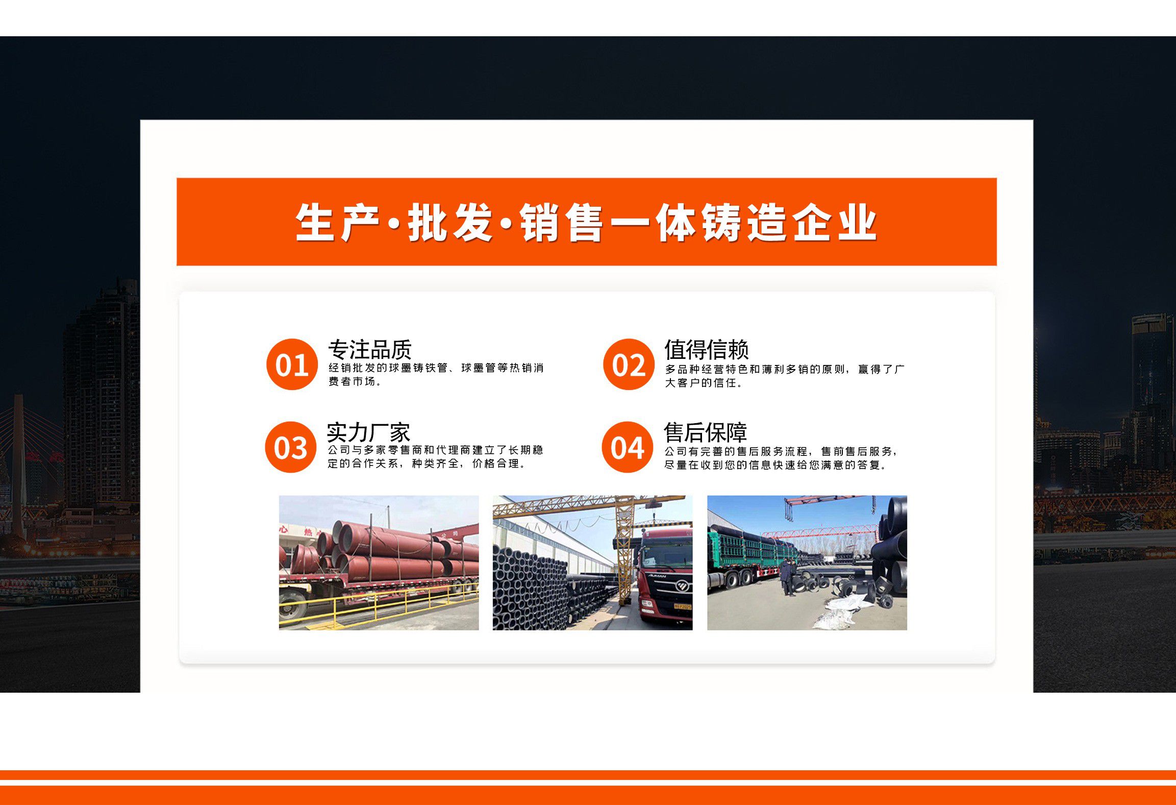 青島金源達(dá)管業(yè)有限公司主要經(jīng)營(yíng)各種規(guī)格球墨鑄鐵管,球墨管,球墨鑄鐵管廠家等產(chǎn)品,質(zhì)量可靠,誠(chéng)信經(jīng)營(yíng),值得信賴! 青島金源達(dá)管業(yè)有限公司始終堅(jiān)持“誠(chéng)信立業(yè),追求卓越,合作共贏,共同發(fā)展”,竭誠(chéng)歡迎各界朋友來(lái)廠參觀指導(dǎo),洽談業(yè)務(wù)。我們?cè)概c您攜手共進(jìn),互惠雙贏,共創(chuàng)未來(lái)! 公司堅(jiān)持“以?shī)^斗者為本”的理念,關(guān)心關(guān)愛(ài)職工,職工的獲得感、幸福感更加充實(shí)、更有保障、更可持續(xù);秉承“忠誠(chéng)企業(yè)、勇于擔(dān)當(dāng)、開(kāi)拓創(chuàng)新、主動(dòng)作為”,堅(jiān)持黨建領(lǐng)航、創(chuàng)新驅(qū)動(dòng)、文化塑魂、奉獻(xiàn)社會(huì),全面致力于綠色、低碳、高效、高質(zhì)量發(fā)展。 愿與各界朋友攜手并進(jìn),共創(chuàng)未來(lái)!...